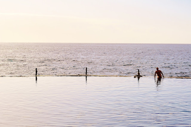Takaisin hotellilla... Mentiin illalliselle jonka jälkeen päätettii lähteä ulos muutamalle rentouttavalle. Mentiin ihan hotellin takana sijaitsevaan terassibaariin jossa samalla katsottiin dartsia mikä oli ihan kuollettvan tylsää. Mutta onneksi jännä tennismatsi pelasti illan :D Vaihdettiin myöhemmin viereiseen Route 66 baariin jossa soi loistava livemusa ja oli mukava meininki. Siinä tutustuttiin ja juteltiin muutamien brittien ja paikan baarimikkojen kanssa. Baarista lähdettiin nopeasti käymään "jatkoilla" Yhden työntekijän luona joka asuu Los Gigantesissa. Sieltä lähdettiin kävelemään mukavan lämpimässä yössä hotellille. Yölliseen kävelyretkeen kuului mm. huonoja vitsejä, paljon naurua (johtuen väsymyksestä, oikeesti), kaktuksille huuliharppuserenadeja by Tiia ja loistavin idea ikinä; yöuinti luonnonaltaassa!! Kun päästiin altaalle vieville rappusille alkoi tuntua siltä että oliko tämä sittenkään niin hyvä idea... Allas ei ole valasitu, sen pohja on liukas ja aallot olivat melko isot. Innoissamme silti laskeuduttiin altaalle ja eikun vaatteet pois ja pulahdus ihanan lämpimään meriveteen! Kiivettiin altaan reunalle, istuttiin ja katseltiin merta ja tähtiä. Aallot löi altaan reunaan, oli lämmintä ja tähdenletojakin näkyi. Se oli kyllä semmonen niinsanottu elokuvahetki :D Mutta oli ihan sairaan hauskaa. Yöllisen uimaretken jälkeen noin klo 6.30 lähdettiin hotellille ja respan ohi (hyvin nopesti :D) suoraan huoneeseen ja eikun untenmaille!